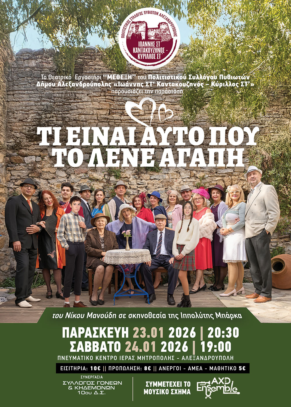 O Πολιτιστικός Σύλλoγος Πυθιωτών Δήμου Αλεξανδρούπολης «Ιωάννης ΣΤ ́ Καντακουζηνός– Κύριλλος ΣΤ ́» με το Θεατρικό Εργαστήρι του ‘‘ΜΕΘΕΞΗ’’ παρουσιάζει την Θεατρική Παράσταση «ΤΙ ΕΙΝΑΙ ΑΥΤΟ ΠΟΥ ΤΟ ΛΕΝΕ ΑΓΑΠΗ» του Νίκου Μανούδη στο Πνευματικό Κέντρο Ιεράς Μητρόπολης Αλεξανδρούπολης. . Σκηνοθεσία : Ιππολύτη Μπάρκα. . Συμμετέχει το μουσικό σχήμα ΑΧD Ensemble. . Συνεργασία με τον...