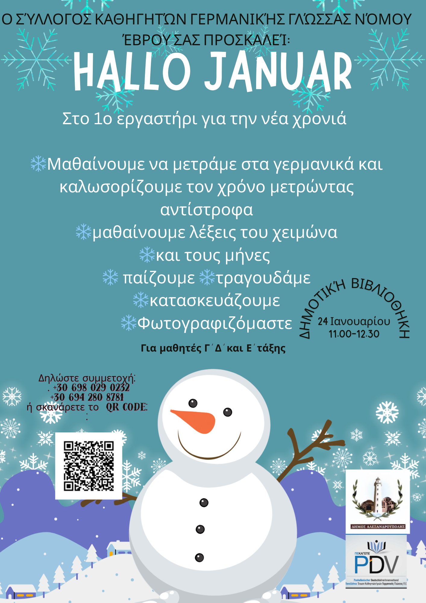 Ο Σύλλογος Καθηγητών Γερμανικής Γλώσσας Ν. Έβρου σας προσκαλεί στο «Hallo Januar»! Ένα χειμωνιάτικο εργαστήρι γεμάτο παιχνίδι, τραγούδι και δημιουργικές δραστηριότητες, όπου τα παιδιά γνωρίζουν τα γερμανικά, μαθαίνουν να μετρούν, ανακαλύπτουν λέξεις του χειμώνα και καλωσορίζουν τη νέα χρονιά με χαμόγελο. ❄️☃️