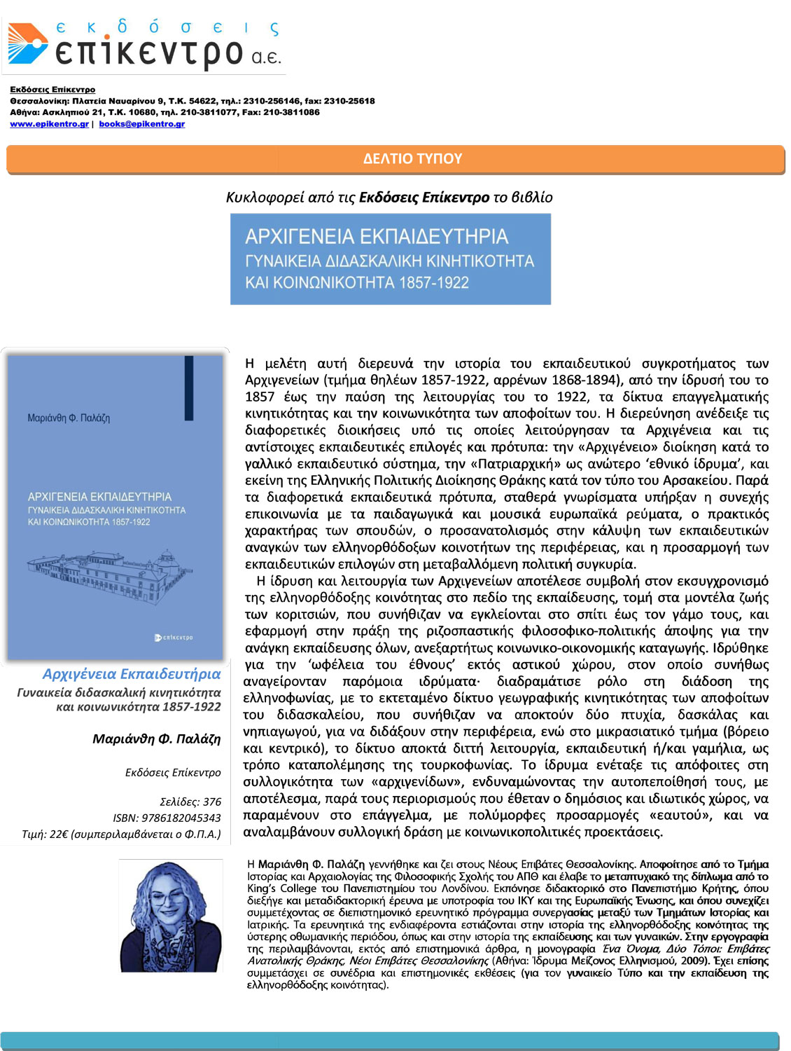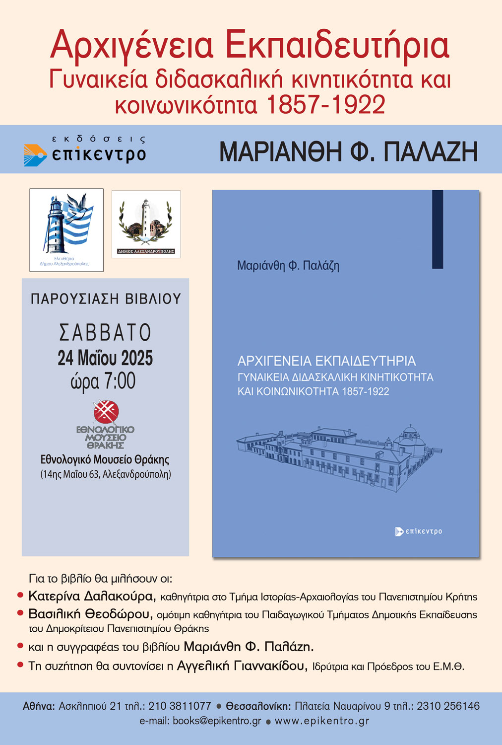 Βιβλιοπαρουσίαση του βιβλίου της Μαριάνθης Φ. Παλάζης «Αρχιγένεια Εκπαιδευτήρια Γυναικεία διδασκαλική κινητικότητα και κοινωνικότητα 1857-1922»