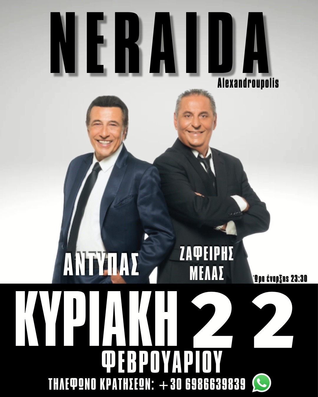 Μια μεγάλη λαϊκή βραδιά έρχεται στην Αλεξανδρούπολη. Την Κυριακή 22 Φεβρουαρίου, ο Αντύπας και ο Ζαφείρης Μελάς ενώνουν τις φωνές τους στη “Νεράιδα” για μια μοναδική εμφάνιση γεμάτη επιτυχίες.