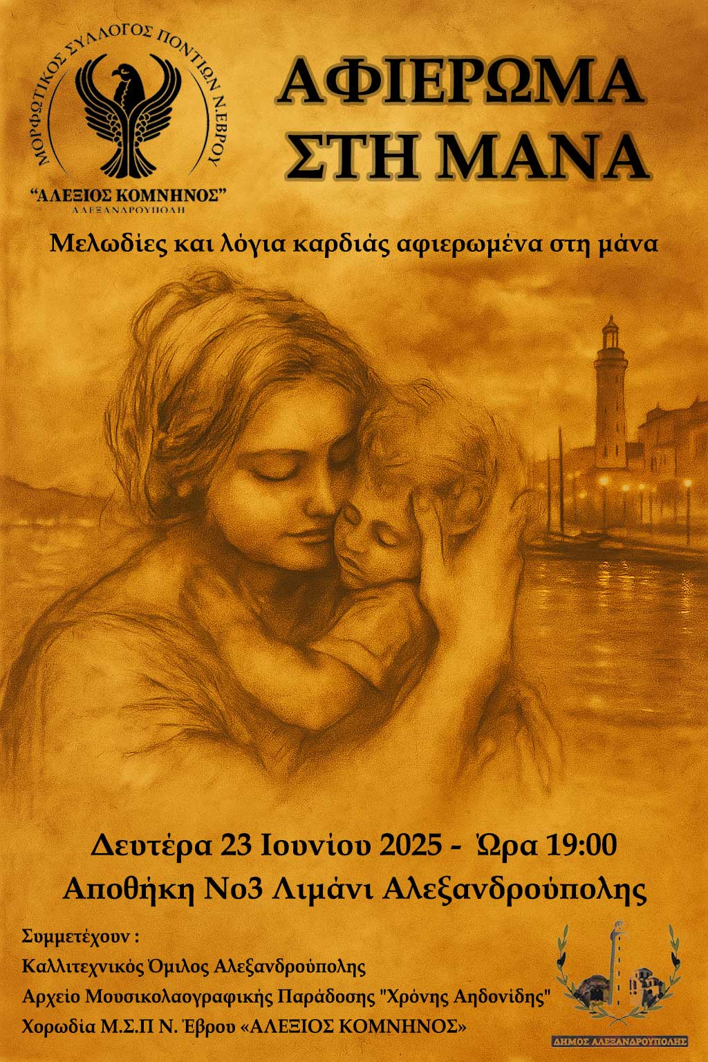 Μελωδίες και λόγια καρδιάς από τρεις χορωδίες που τραγουδούν την πιο ιερή μορφή της ζωής μας:τη μάνα.Συμμετέχουν: Καλλιτεχνικός Όμιλος Αλεξανδρούπολης – ΚΟΑ Αρχείο Μουσικολαογραφικής Παράδοσης “Χρόνης Αηδονίδης”και η Χορωδία του Αλέξιου Κομνηνού