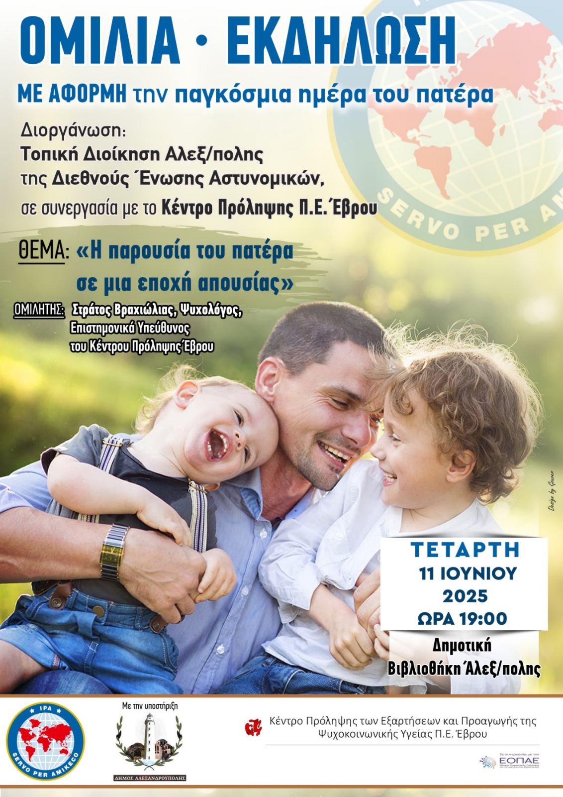 Η Διεθνής Ένωση Αστυνομικών / Τοπική Διοίκηση Αλεξ/πολης με αφορμή την παγκόσμια ημέρα του πατέρα, σε συνεργασία με το Κέντρο Πρόληψης των Εξαρτήσεων και Προαγωγής της Ψυχοκοινωνικής Υγείας Π.Ε. Έβρου και του Δήμου Αλεξ/πολης, διοργανώνει Ομιλία – Ενημέρωση.