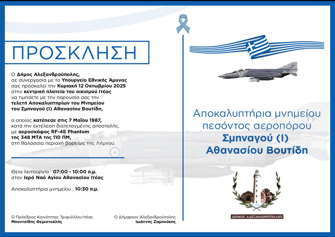 Ο Δήμος Αλεξανδρούπολης, σε συνεργασία με το Υπουργείο Εθνικής Άμυνας, σας προσκαλεί την Κυριακή 12 Οκτωβρίου 2025 στην κεντρική πλατεία του οικισμού Ιτέας, να τιμήσουμε όλοι μαζί τον συντοπίτη μας ήρωα, Σμηναγό (Ι) Αθανάσιο Βουτίδη. Ο Σμηναγός Αθανάσιος Βουτίδης κατέπεσε στις 7 Μαΐου 1987, εκτελώντας διατεταγμένη αποστολή με αεροσκάφος RF-4E Phantom της 348 ΜΤΑ της...