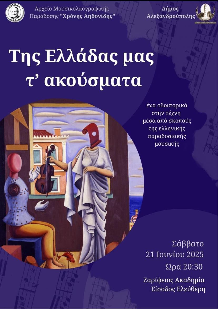 Με αφορμή την Ευρωπαϊκή Ημέρα της Μουσικής, Δήμος Αλεξανδρούπολης και το Αρχείο Μουσικολαογραφικής Παράδοσης «Χρόνης Αηδονίδης», σας προσκαλούν το Σάββατο 21 Ιουνίου και ώρα 20:30 στον αύλειο χώρο της Ζαρίφειου Ακαδημίας, σε μια ξεχωριστή μουσική εκδήλωση με άρωμα Ελλάδας. Ένα μοναδικό οδοιπορικό στην τέχνη της ελληνικής παραδοσιακής μουσικής, μέσα από αυθεντικούς σκοπούς, ήχους και μελωδίες...