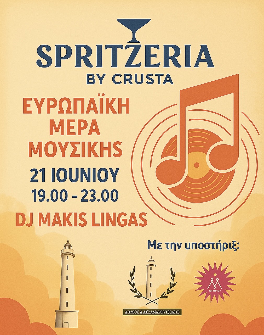 Γιορτάζουμε την ΕΥΡΩΠΑΙΚΗ ΜΕΡΑ ΜΟΥΣΙΚΗΣ στην SPRITZERIA by Crusta παρέα με τις μοναδικες μουσικές του DJ MAKI LINGA που θα μας ταξιδέψει με μουσικές επιλογές σε όλο τον κόσμο και την μουσική του. Την μέρα που η μουσική έχει τον βασικό ρόλο σε όλη την Ευρώπη αλλά και στην Αλεξανδρούπολη, όπου τα τελευταία χρόνια ο...