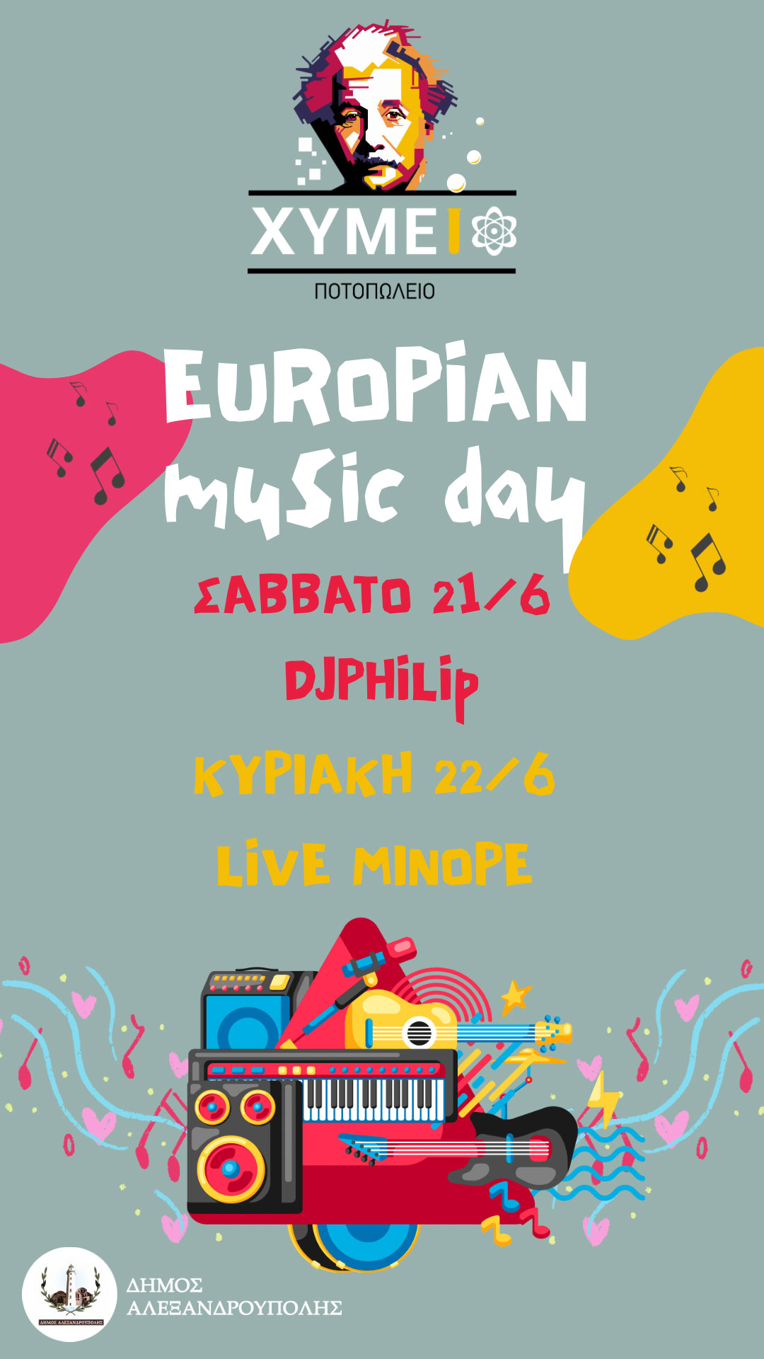 Με αφορμή την Πανευρωπαϊκή Ημέρα Μουσικής, σας προσκαλούμε σε ένα διήμερο μουσικό ταξίδι! Στις 21/6 με Dj και στις 22/6 με live μουσική , ελάτε να γίνουμε μέρος ενός πανευρωπαϊκού εορτασμού, με επίκεντρο τη μουσική και τον άνθρωπο! Σ αυτήν μας την προσπάθεια έχουμε τα τελευταία χρόνια την υποστήριξη του Δήμου Αλεξανδρούπολης που συμμετέχει ενεργά...