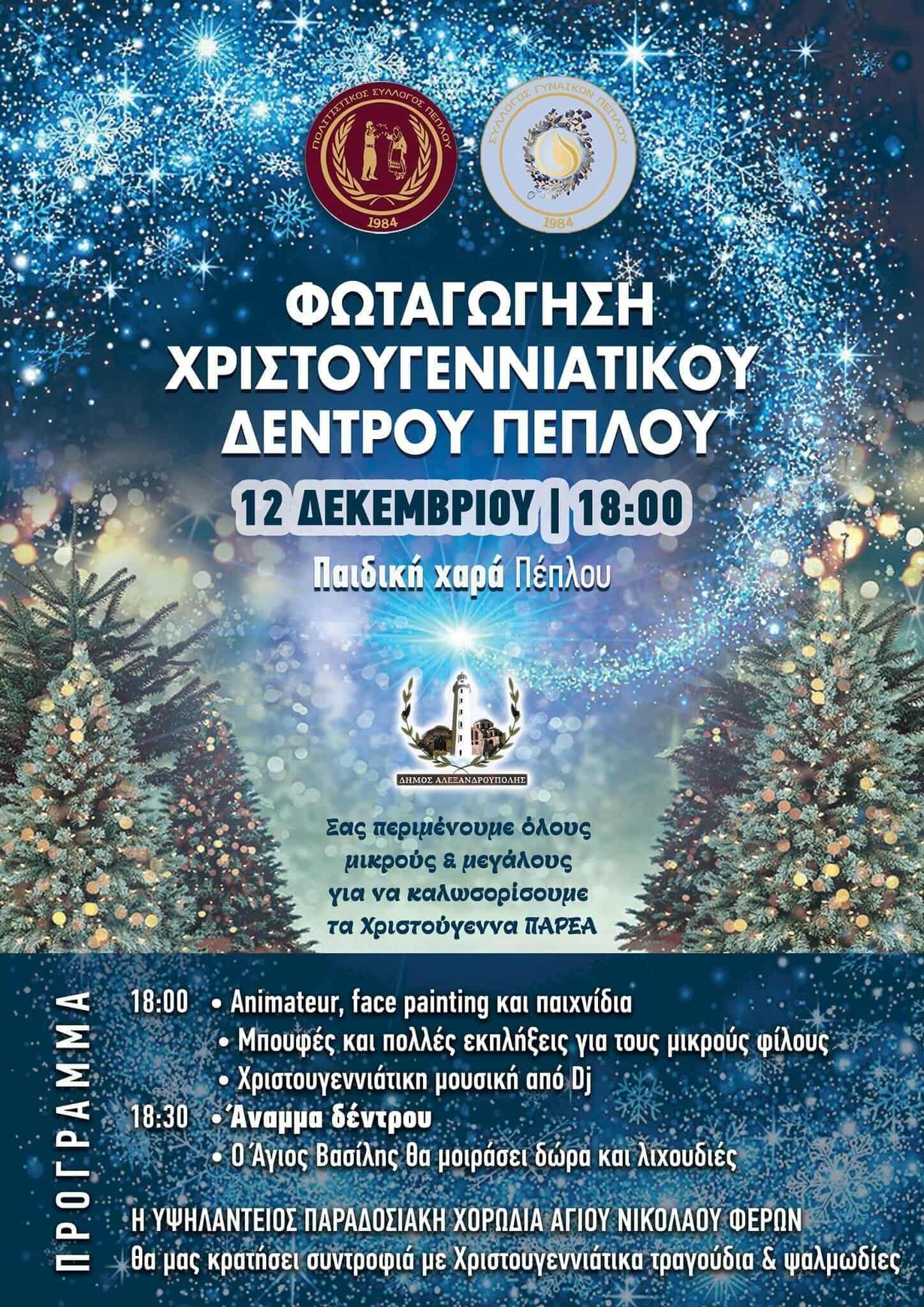 Στη πλατεία Πέπλου Φωταγώγηση του χριστουγεννιάτικου δέντρου με Dj και ανιματέρ από τον Πολιτιστικό Σύλλογο Πέπλου & Πολιτιστικό Σύλλογο Γυναικών Πέπλου.