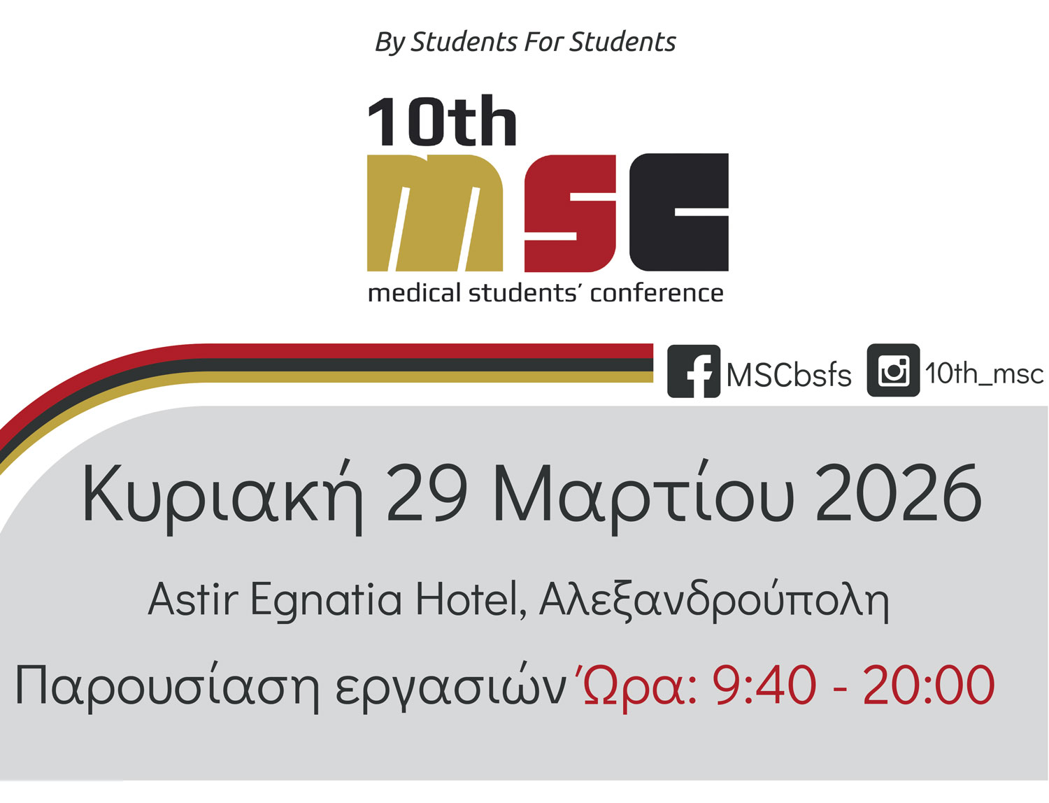 Σας περιμένουμε στις παρουσιάσεις των εργασιών στις 29 Μαρτίου στο Astir Egnatia Το Medical Students’ Conference (M.S.C.) επιστρέφει φέτος για 10η συνεχόμενη χρονιά στην Αλεξανδρούπολη, από τις 27 εώς 29...
