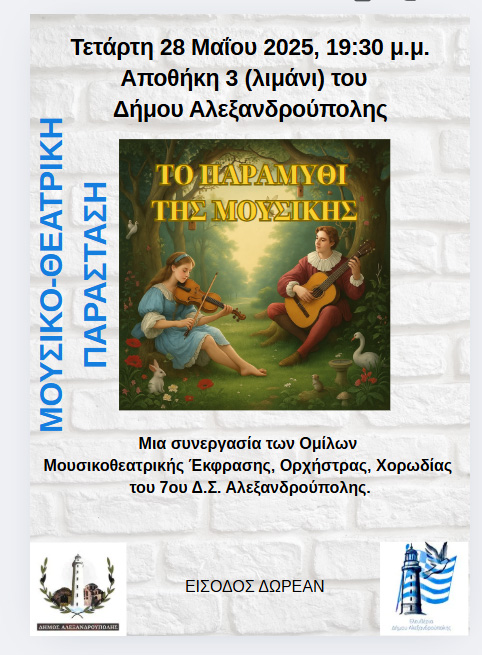 Μουσικοθεατρική παράσταση από τους μαθητές της Δ τάξης του 3ου Δημοτικού Σχολείου Αλεξανδρούπολης. Η πλοκή του έργου διαδραματίζεται σε έναν φάρο/παιχνιδοποιείο, όπου τα παιχνίδια είναι ζωντανά, φέρουν τα τραύματα του χρόνου και την ανάμνηση της χαράς των παιδιών. Τι θα συμβεί όμως όταν η ξεχασμένη φιγούρα θεάτρου σκιών σβήσει τα φώτα του Φάρου; https://youtu.be/-oDUH4H2qCs |